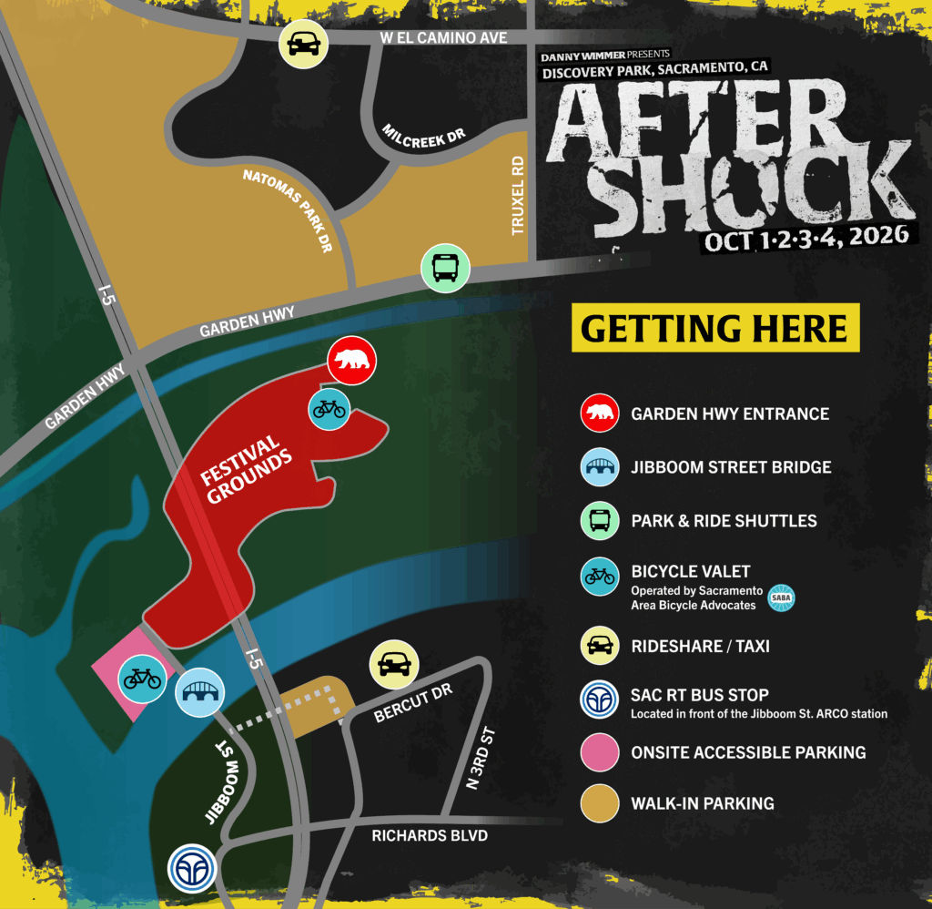 Aftershock has again partnered Sacramento Area Bicycle Advocates to provide a complimentary bike valet onsite at Aftershock. The bike valet will accept all active transportation vehicles including bikes, skateboards and scooters. and will be watched throughout the entire event. If you choose to “self-park” your bike, it is at your own risk. The bike valet will open approximately 90 minutes prior to gate opening time each day