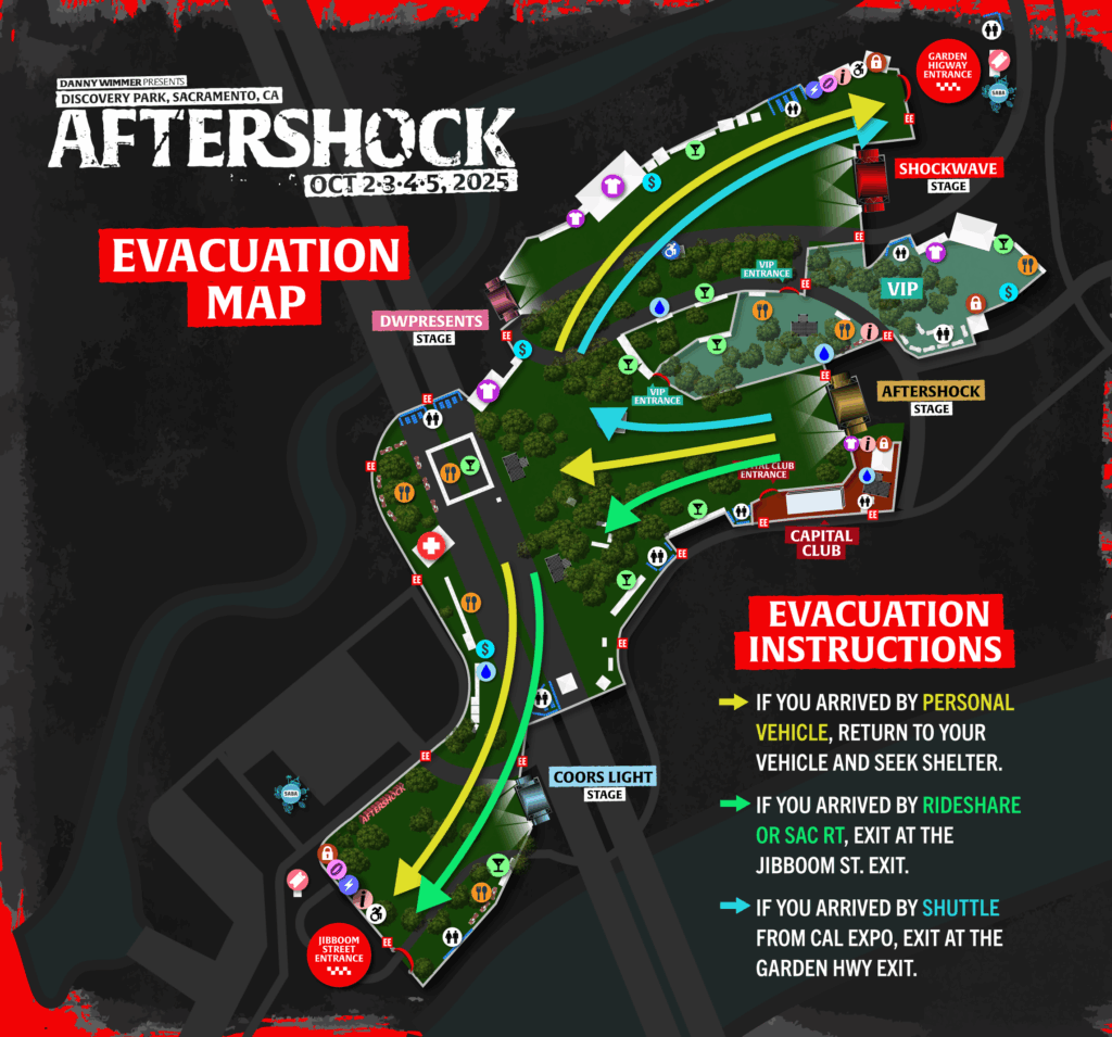 Fans who parked near Discovery Park: During an evacuation, please return to your vehicle promptly. Ensure you make note of which festival entrance you entered through, and exit through that entrance (Garden Highway or Jibboom Street) – unless otherwise directed by Official Festival Messaging and Staff.